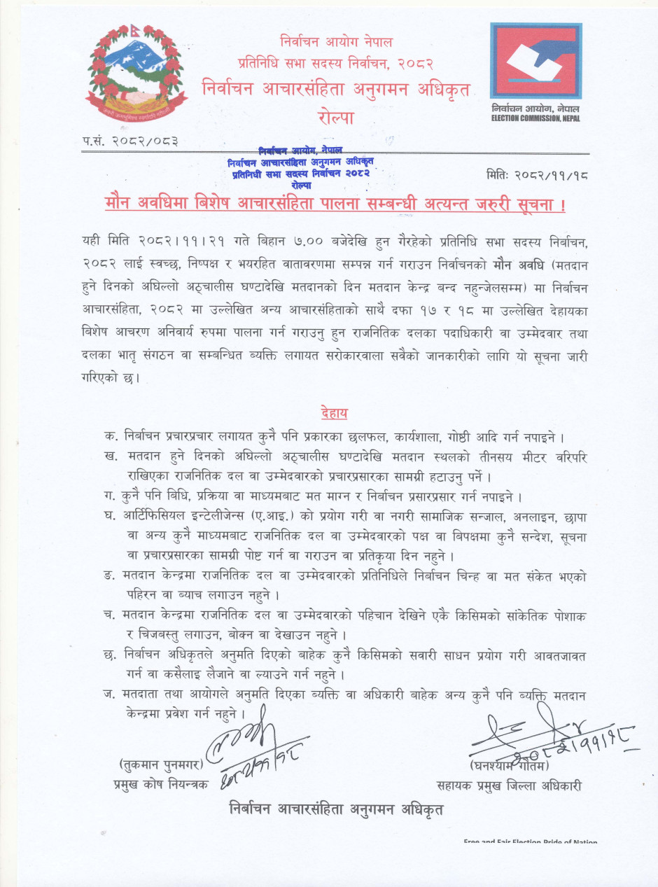 मौन अवधिमा पालना गर्ने आचारसंहिता सम्बन्धी जरुरी सूचना ।